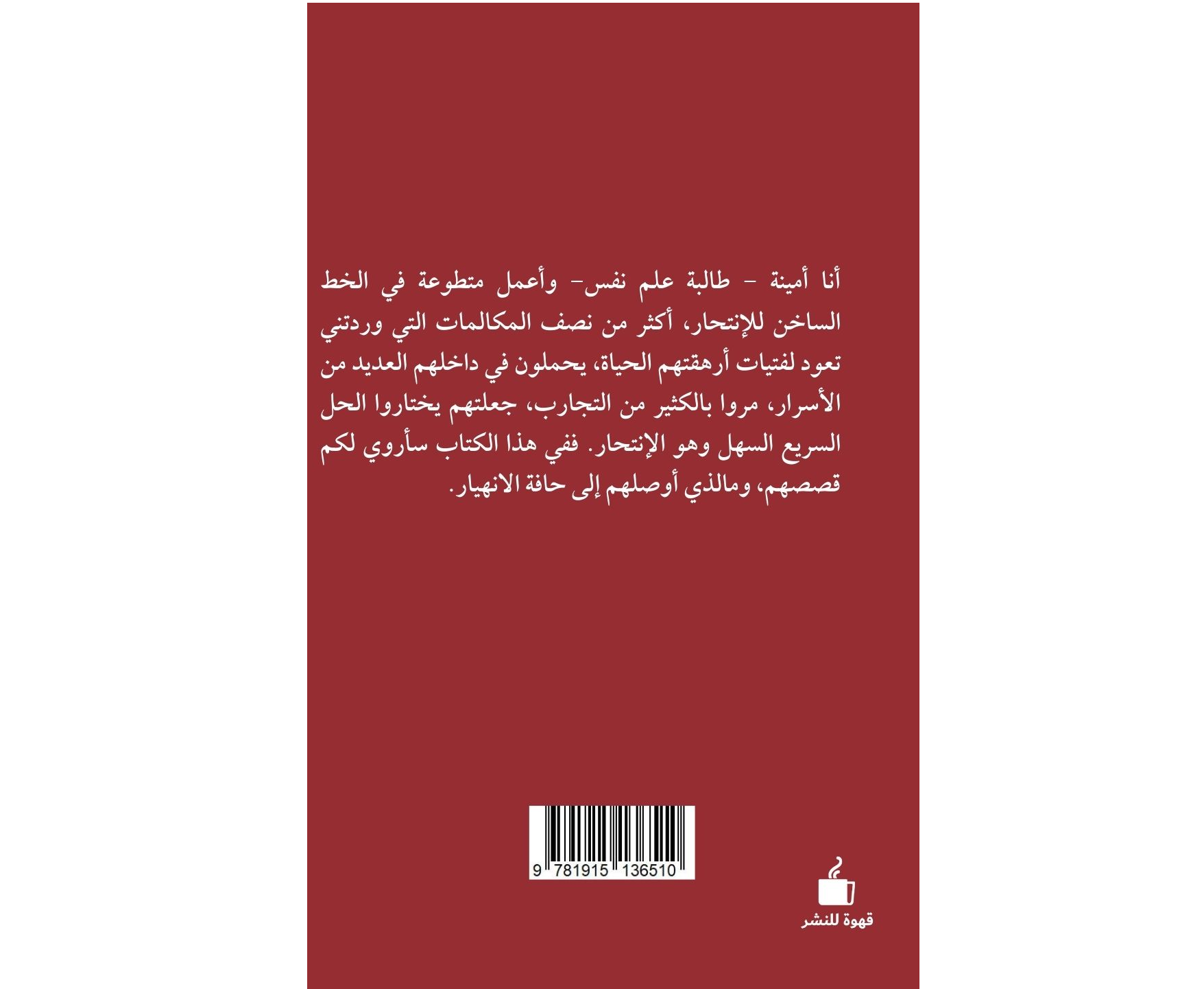 أنا أمينة – طالبة علم نفس- وأعمل متطوعة في الخط الساخن للإنتحار، أكثر من نصف المكالمات التي وردتني تعود لفتيات أرهقتهم الحياة، يحملون في داخلهم العديد من الأسرار، مروا بالكثير من التجارب، جعلتهم يختاروا الحل السريع السهل وهو الإنتحار. ففي هذا الكتاب سأروي لكم قصصهم، وماالذي أوصلهم إلى حافة الانهيار.