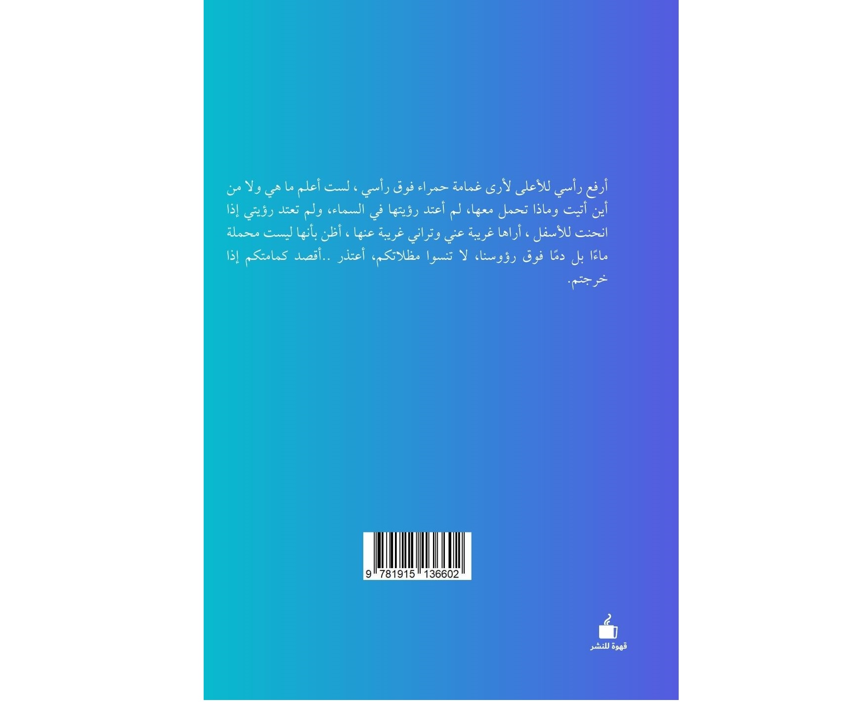 أرفع رأسي للأعلى لأرى غمامة حمراء فوق رأسي ، لست أعلم ما هي ولا من أين أتيت وماذا تحمل معها، لم أعتد رؤيتها في السماء، ولم تعتد رؤيتي إذا انحنت للأسفل ، أراها غريبة عني وتراني غريبة عنها ، أظن بأنها ليست محملة ماءًا بل دمًا فوق رؤوسنا، لا تنسوا مظلاتكم، أعتذر ..أقصد كمامتكم إذا خرجتم.